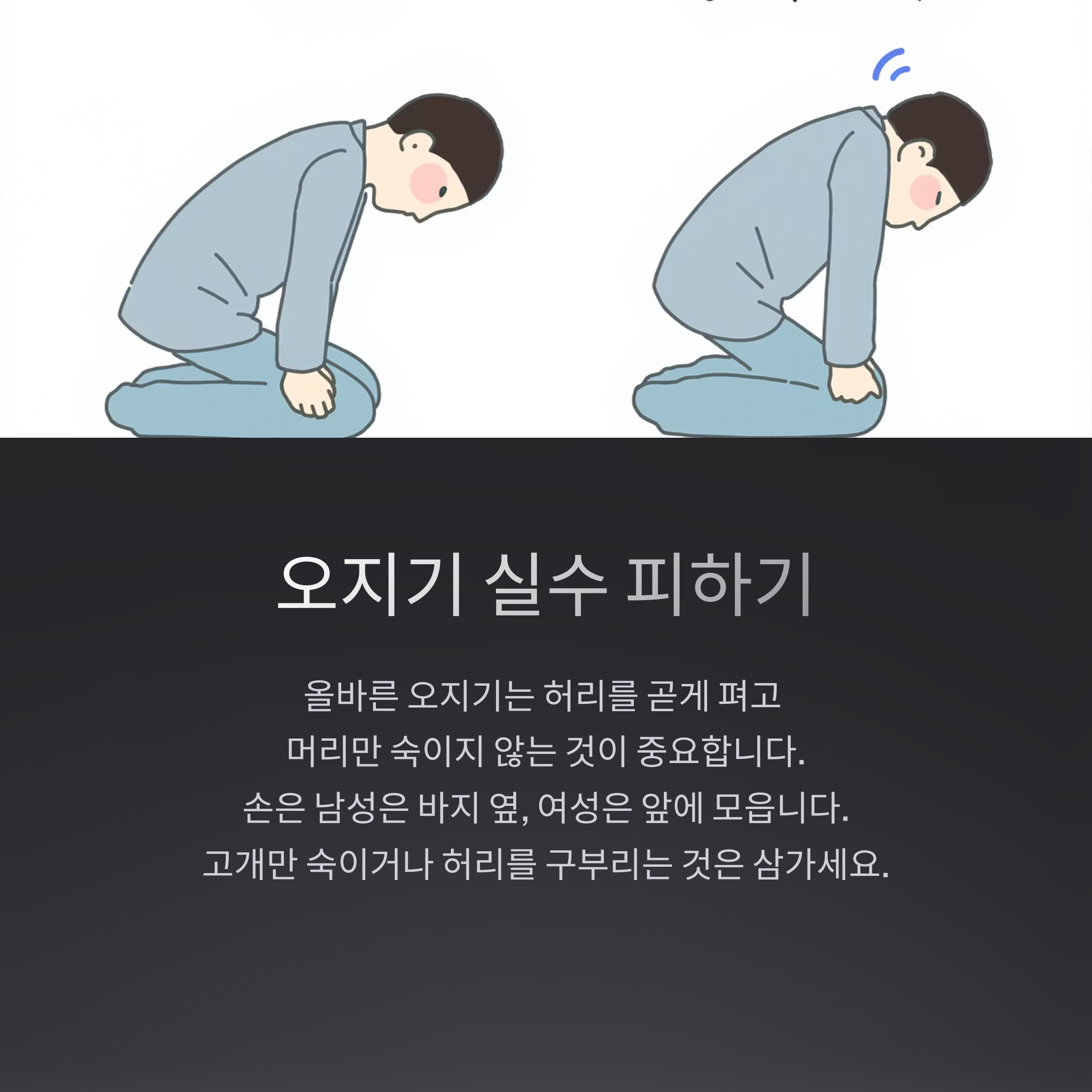 - 너무 빠르게 숙이거나 일어나면 성의 없게 보일 수 있습니다.