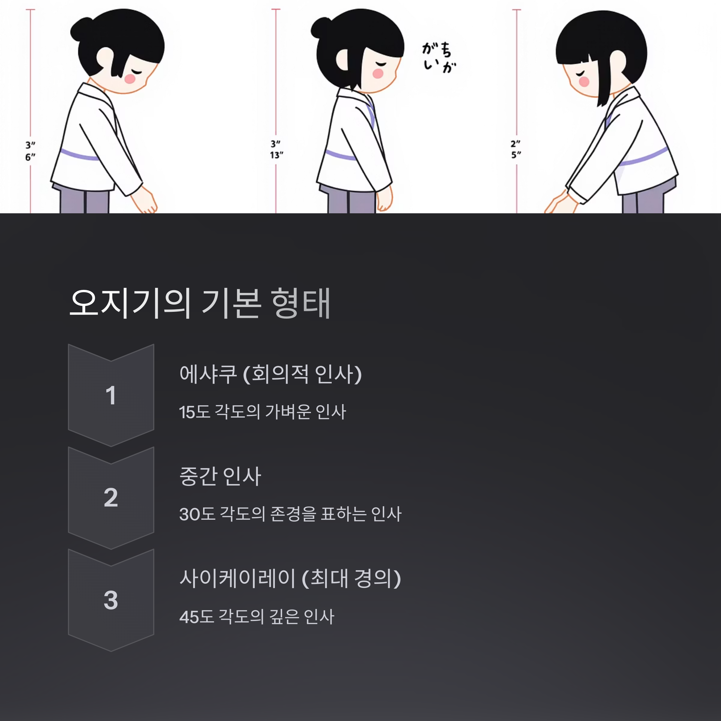 각도와 지속 시간이 다른 이 세 가지 인사법을 알아보겠습니다.