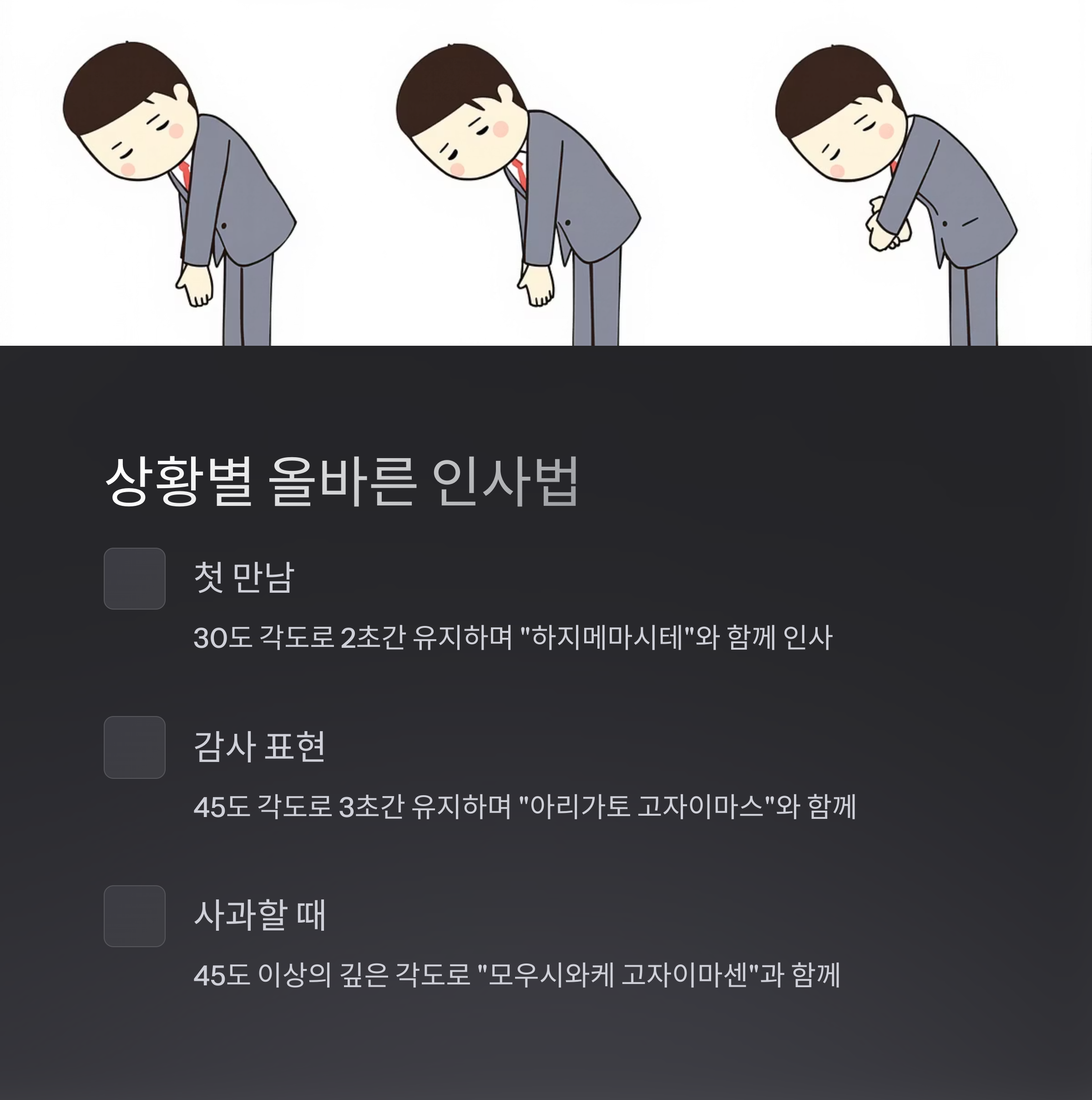 - 숙이는 각도 결정: 상황에 맞는 인사 각도를 선택합니다 (15° / 30-45° / 70-90°).