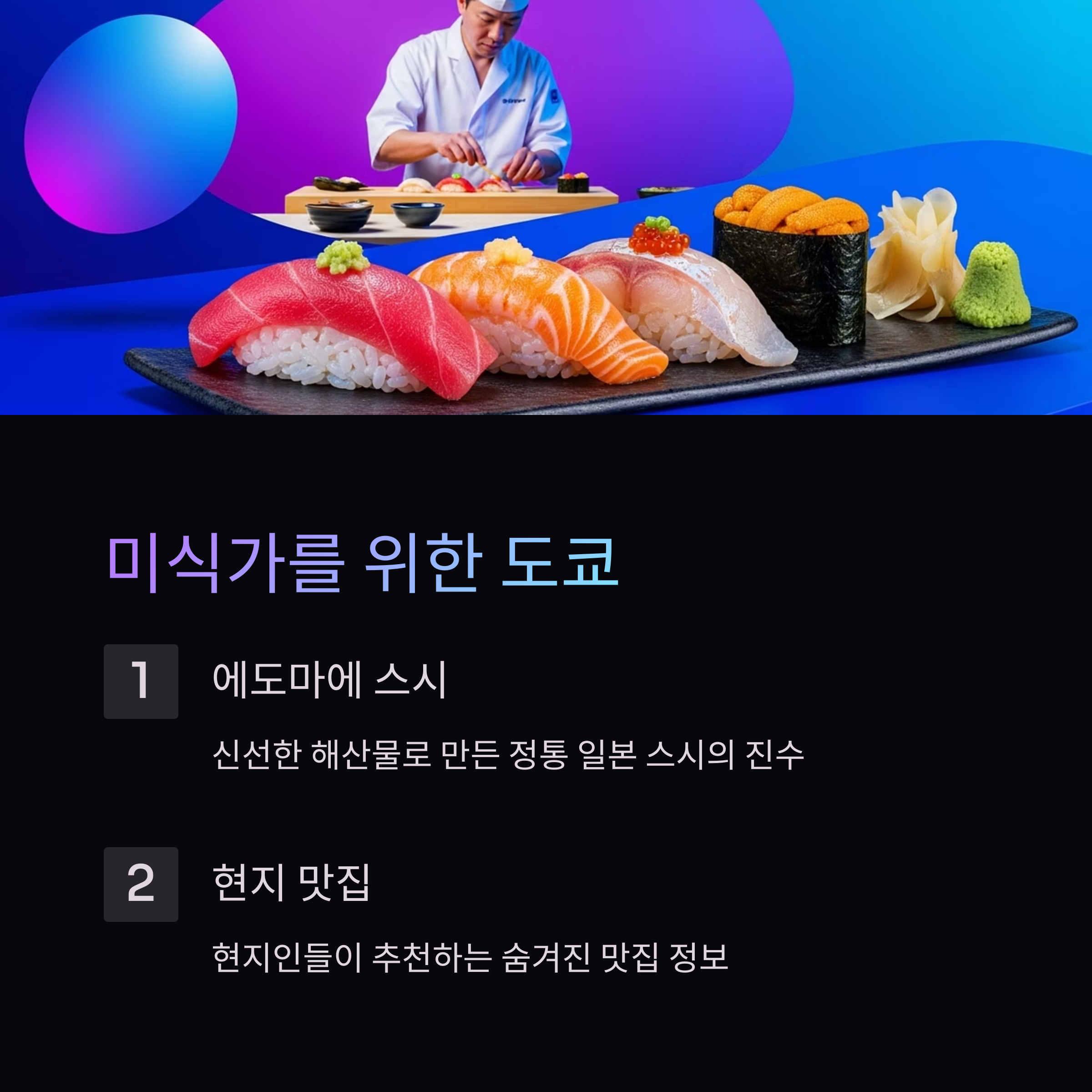 도쿄는 전 세계 미슐랭 별점 레스토랑이 가장 많은 도시로, 전통 일식부터 혁신적인 퓨전 요리까지 다양한 미식 경험을 제공합니다.