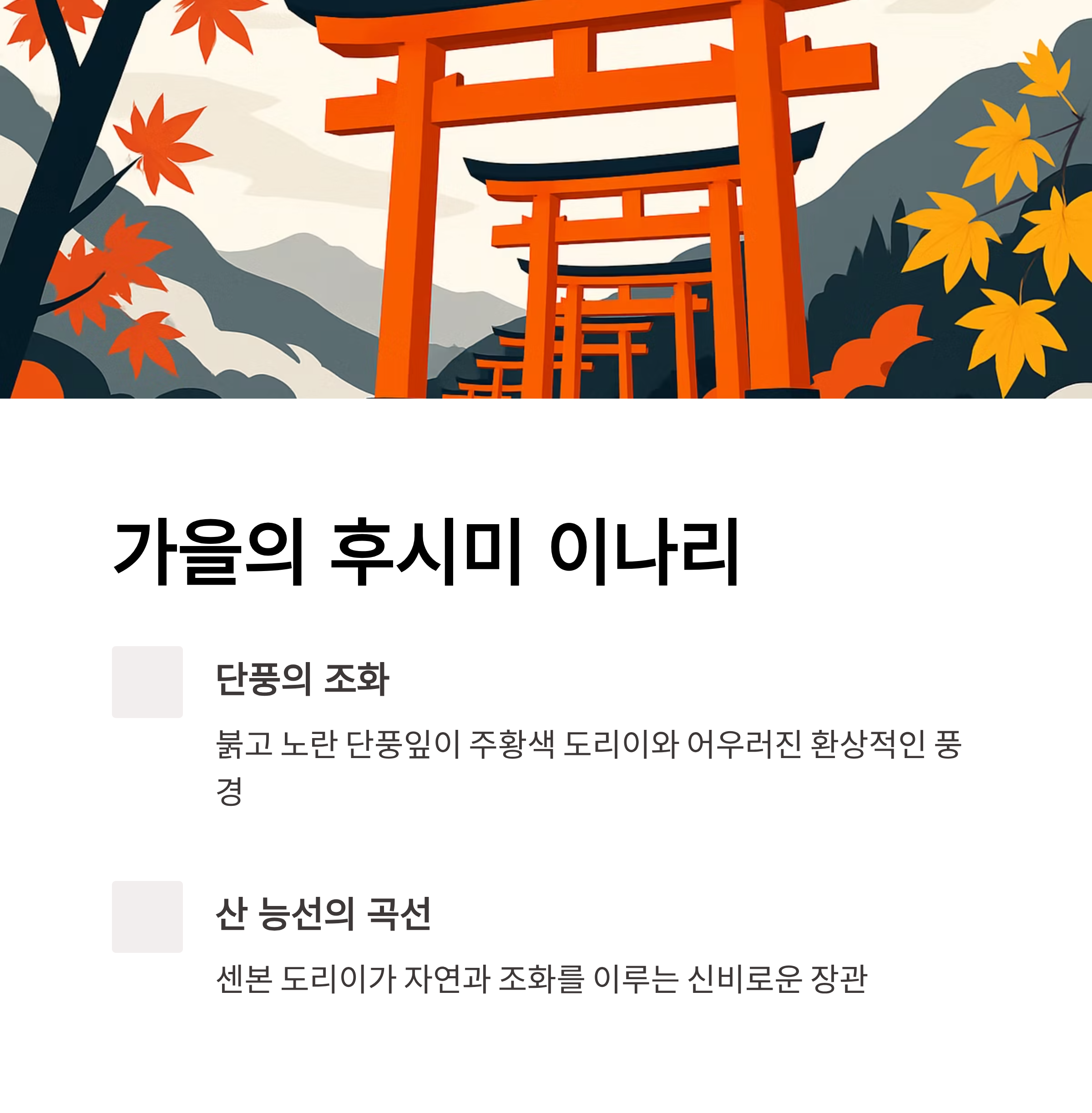 봄에는 벚꽃과 도리이의 조화가, 여름에는 짙은 녹음 속 터널이 신비롭습니다. 가을에는 단풍과 주황색 도리이가 만들어내는 절묘한 색의 향연을 볼 수 있고, 겨울에는 설경 속에서 더욱 선명하게 빛나는 도리이의 모습을 감상할 수 있습니다.