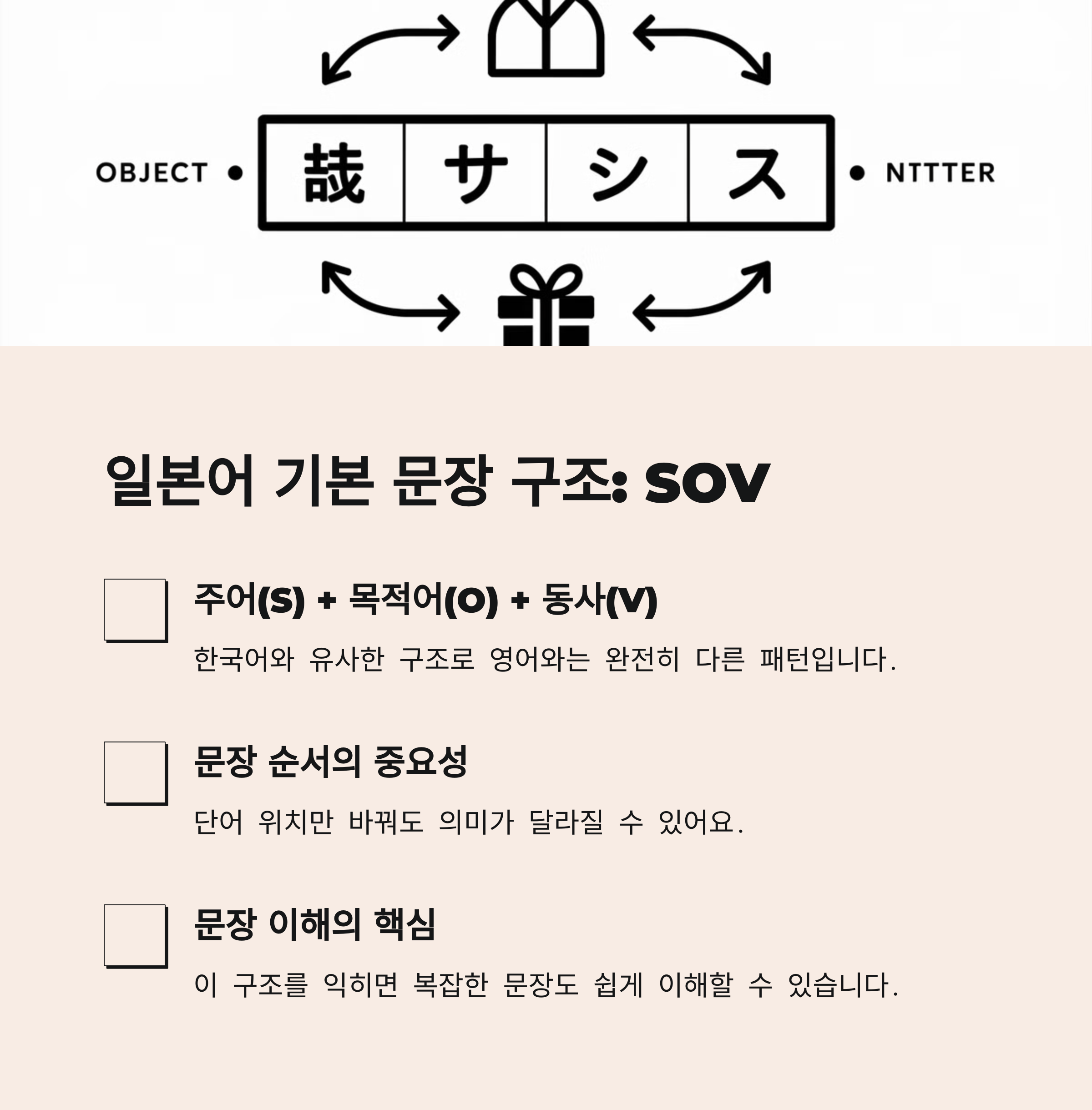 일본어 문장의 기본 구조는 영어와 다릅니다. 영어는 SVO (주어-동사-목적어) 구조지만, 일본어는 SOV (주어-목적어-동사) 구조입니다.