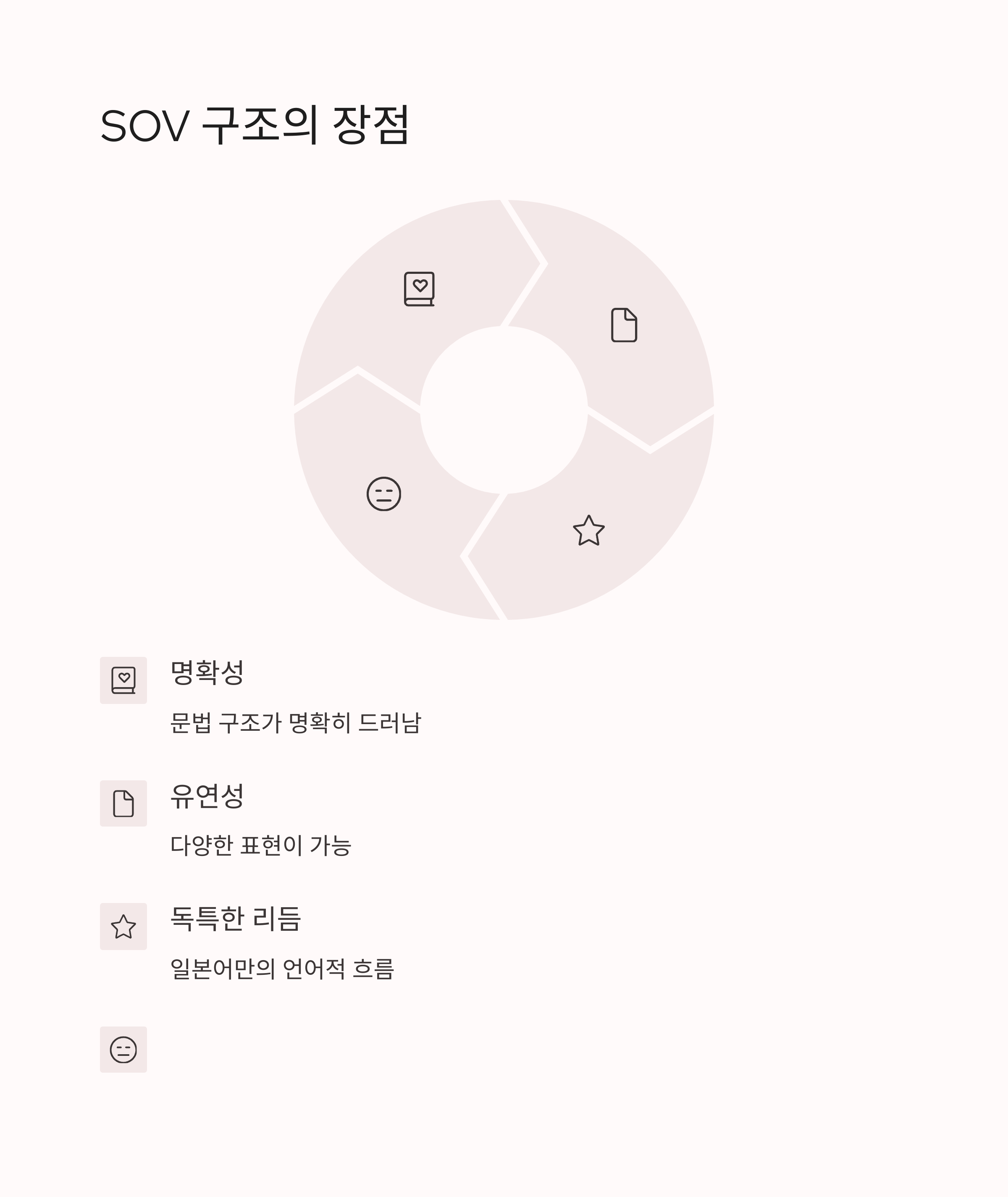 일본어는 그와 다르게 SOV (주어-목적어-동사) 구조를 가집니다.