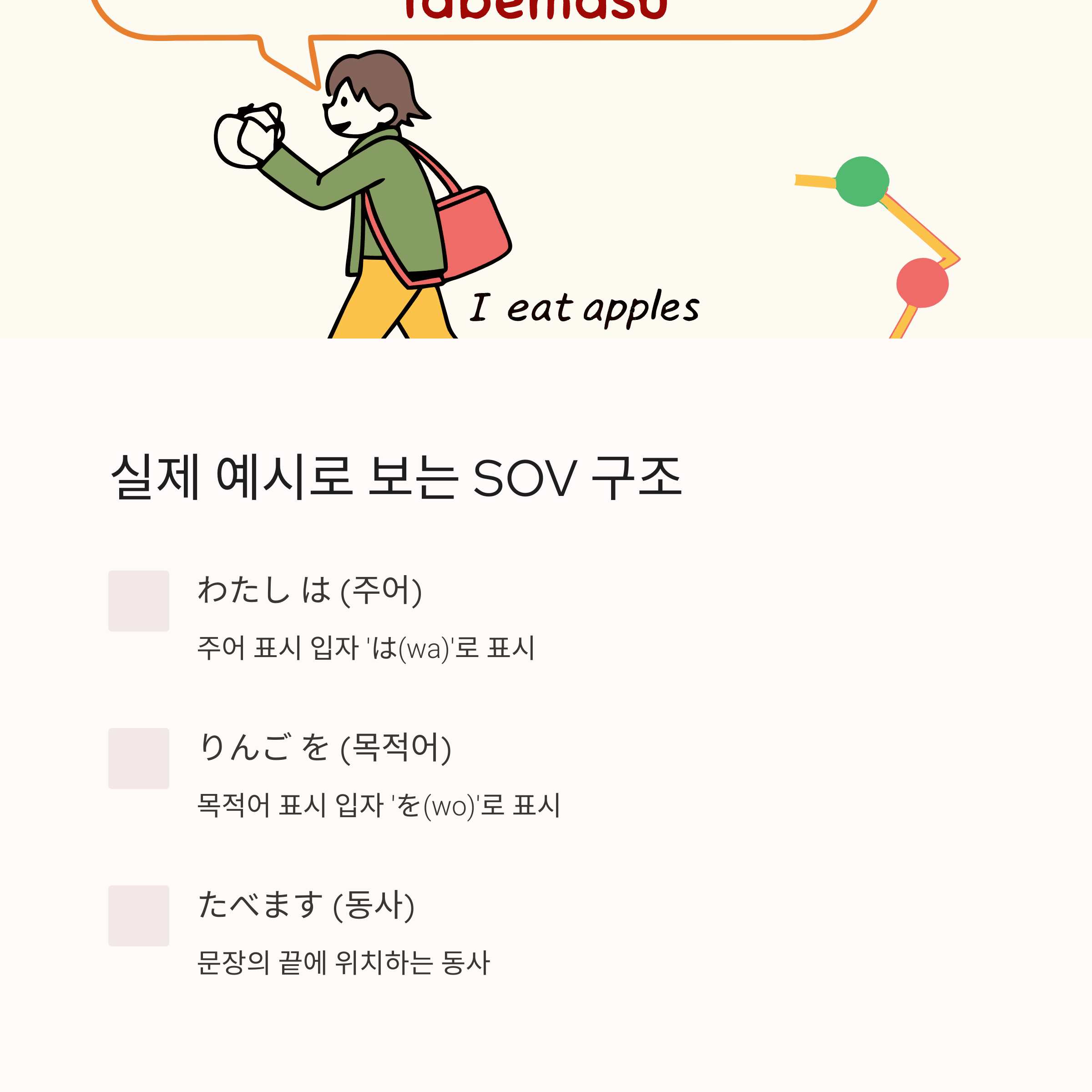 - SOV 구조: 일본어는 항상 주어 + 목적어 + 동사 순서로 문장이 구성됩니다.